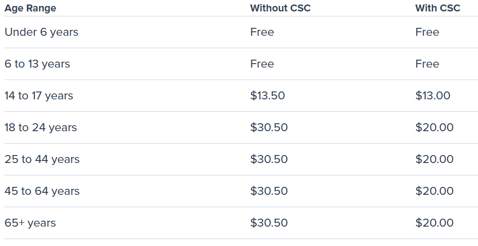 Community Services Card (CSC) holders receive reduced fees.